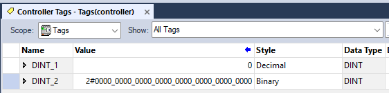 The Style attribute defines how a tag is displayed in Studio 5000 Logix Designer. You can use this attribute to monitor the individual bits in a DINT tag instead of the decimal number.